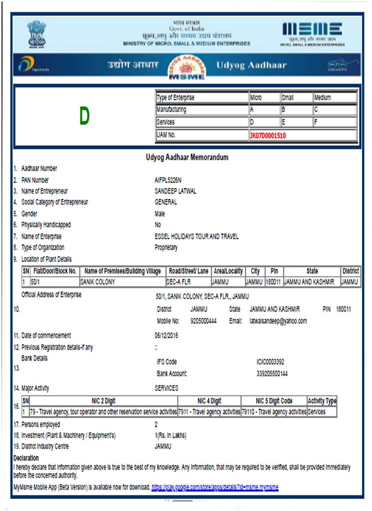 We have the great pleasure in introducing ourselves as a leading Travel agency, working, from Last 16yrs under the name & style as ESS EL HOLIDAYS TOUR & TRAVELS, situated in Sainik Colony Jammu (J&K), duly registered with J& K state tourism Deptt. & also a member of TAAJ. (Travel agent association of Jammu) & IATO:- (Indian Association of tour Operators). Since long time, we Organizing and providing various types of services such as:-